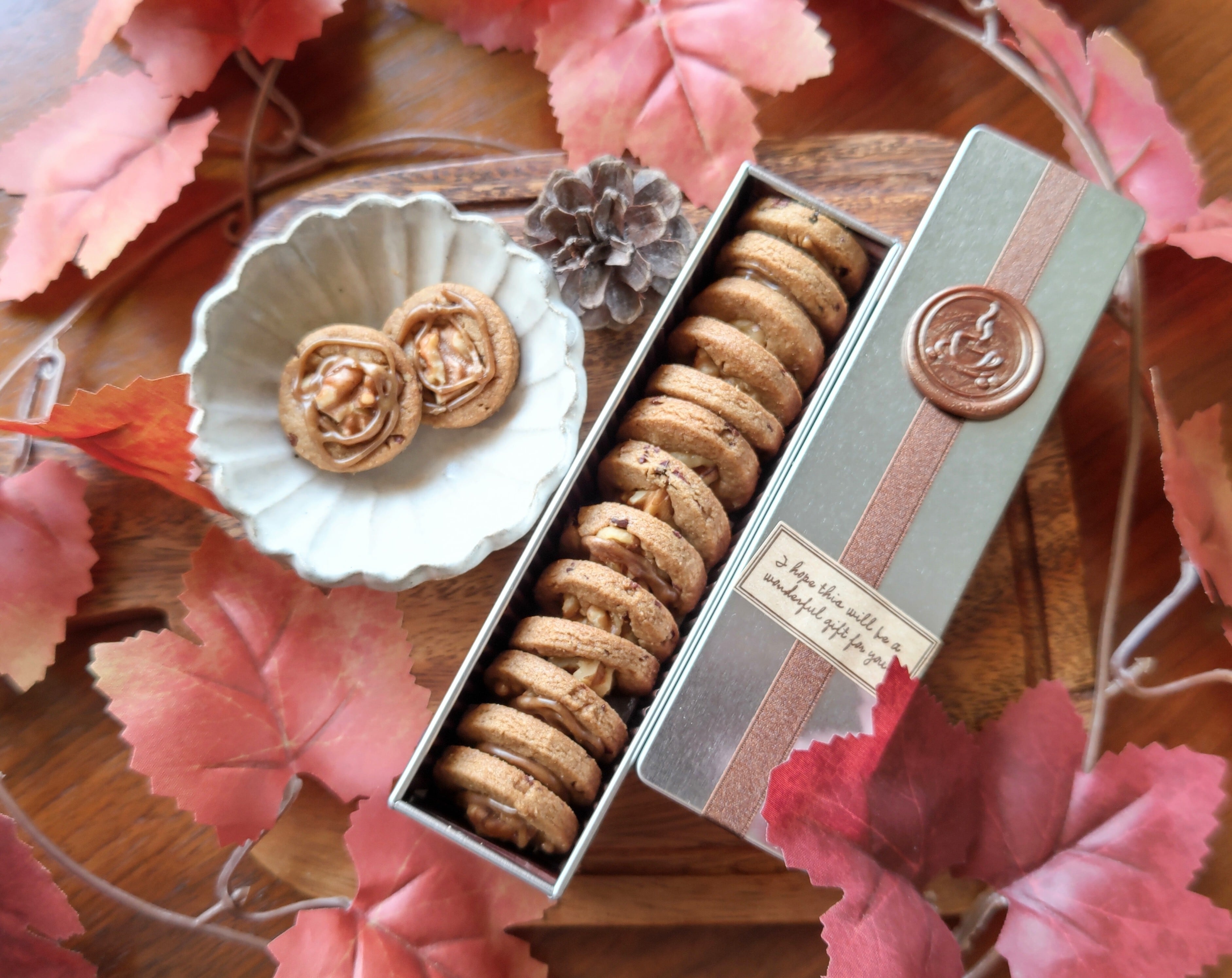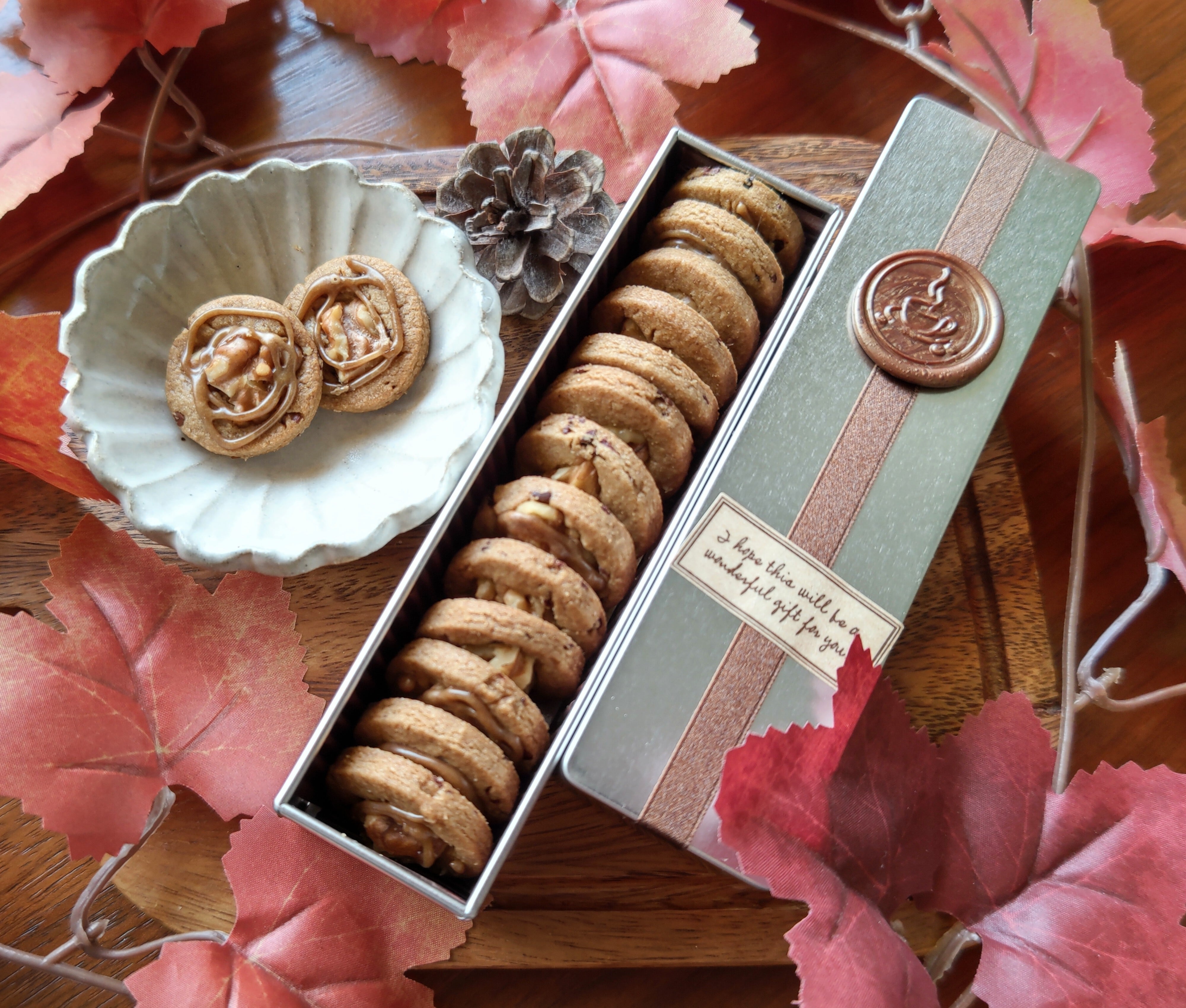 コーヒー味のサブレにカカオニブを練り込み、1枚1枚に胡桃を乗せて焼きあげてコーヒーアイシングで仕上げました。